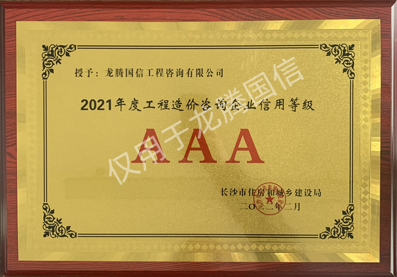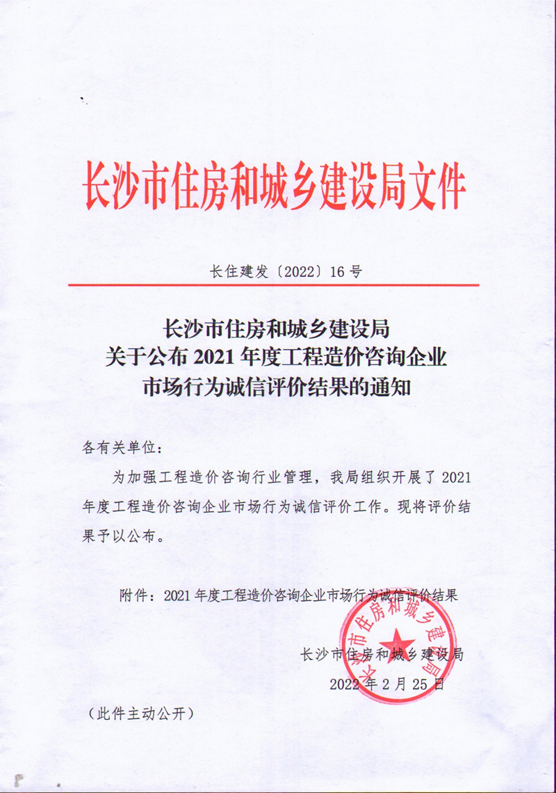 長沙市住房和城鄉(xiāng)建設局為加強工程造價咨詢行業(yè)管理,組織開展了2021年度工程造價咨詢企業(yè)市場行為誠信評價工作,我單位獲評“2021年度工程造價咨詢企業(yè)信用等級AAA”。