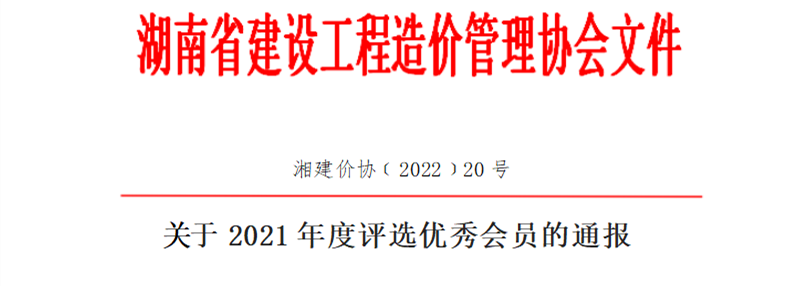近日,為促進(jìn)省內(nèi)工程造價(jià)咨詢行業(yè)高質(zhì)量發(fā)展,樹立先進(jìn)典型,調(diào)動(dòng)會(huì)員的積極性和創(chuàng)造性,根據(jù)《湖南省建設(shè)工程造價(jià)管理協(xié)會(huì)關(guān)于開展2021年度評(píng)選優(yōu)秀會(huì)員活動(dòng)的通知》,經(jīng)會(huì)員申報(bào)、評(píng)審小組評(píng)審、集體研究、結(jié)果公示等環(huán)節(jié),我單位榮獲“2021年度優(yōu)秀單位”、注冊(cè)造價(jià)工程師陳建榮(黨員)榮獲“優(yōu)秀個(gè)人”。