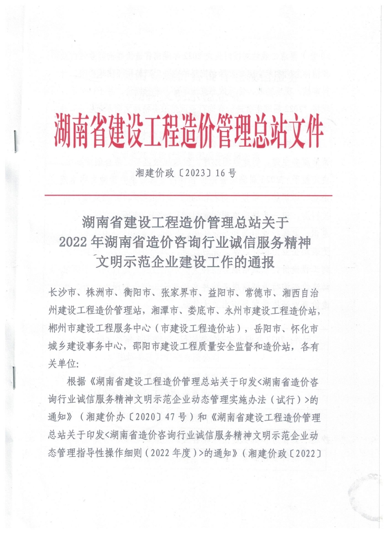 根據(jù)《湖南省建設(shè)工程造價(jià)管理總站關(guān)于印發(fā)<湖南省造價(jià)咨詢行業(yè)誠(chéng)信服務(wù)精神文明示范企業(yè)動(dòng)態(tài)管理實(shí)施辦法(試行)>的通知》(湘建價(jià)辦〔2020〕47號(hào))和《湖南省建設(shè)工程造價(jià)管理總站關(guān)于印發(fā)<湖南省造價(jià)咨詢行業(yè)誠(chéng)信服務(wù)精神文明示范企業(yè)動(dòng)態(tài)管理指導(dǎo)性操作細(xì)則(2022年度)>的通知》(湘建價(jià)政〔2022〕50號(hào))要求,我站對(duì)按時(shí)提交2022年湖南省造價(jià)咨詢行業(yè)誠(chéng)信服務(wù)精神文明示范企業(yè)建設(shè)活動(dòng)資料的企業(yè),嚴(yán)格按照實(shí)地考察、材料審核、現(xiàn)場(chǎng)驗(yàn)收、信用信息查詢等環(huán)節(jié)進(jìn)行評(píng)價(jià),并予以公示,龍騰國(guó)信獲評(píng)“示范企業(yè)”。