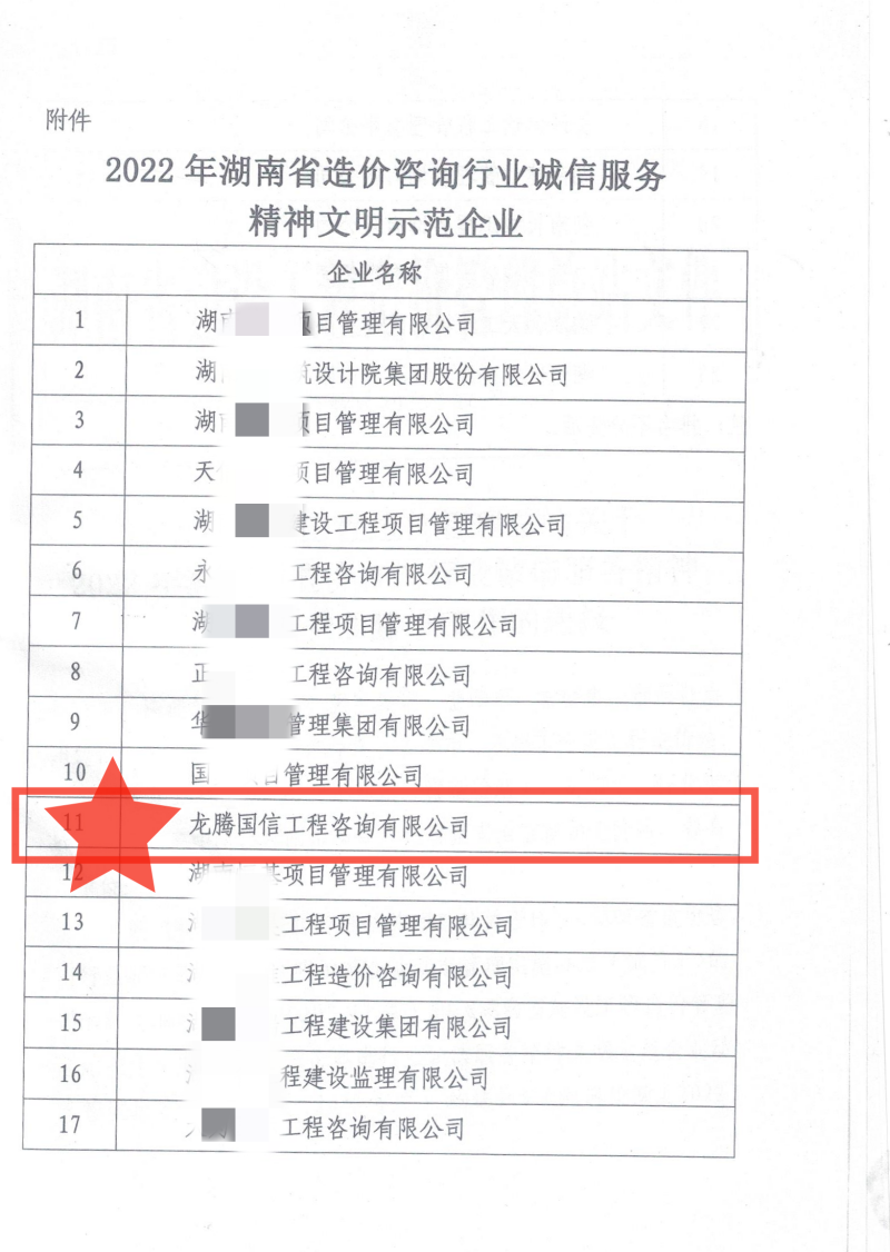 【喜報(bào)】龍騰國(guó)信榮獲“2022年湖南省造價(jià)咨詢行業(yè)誠(chéng)信服務(wù)精神文明示范企業(yè)”