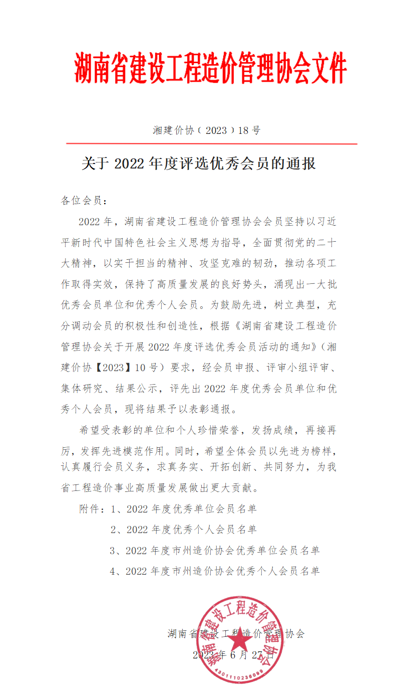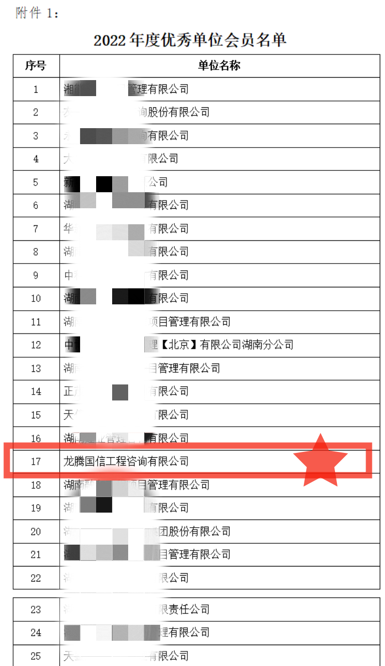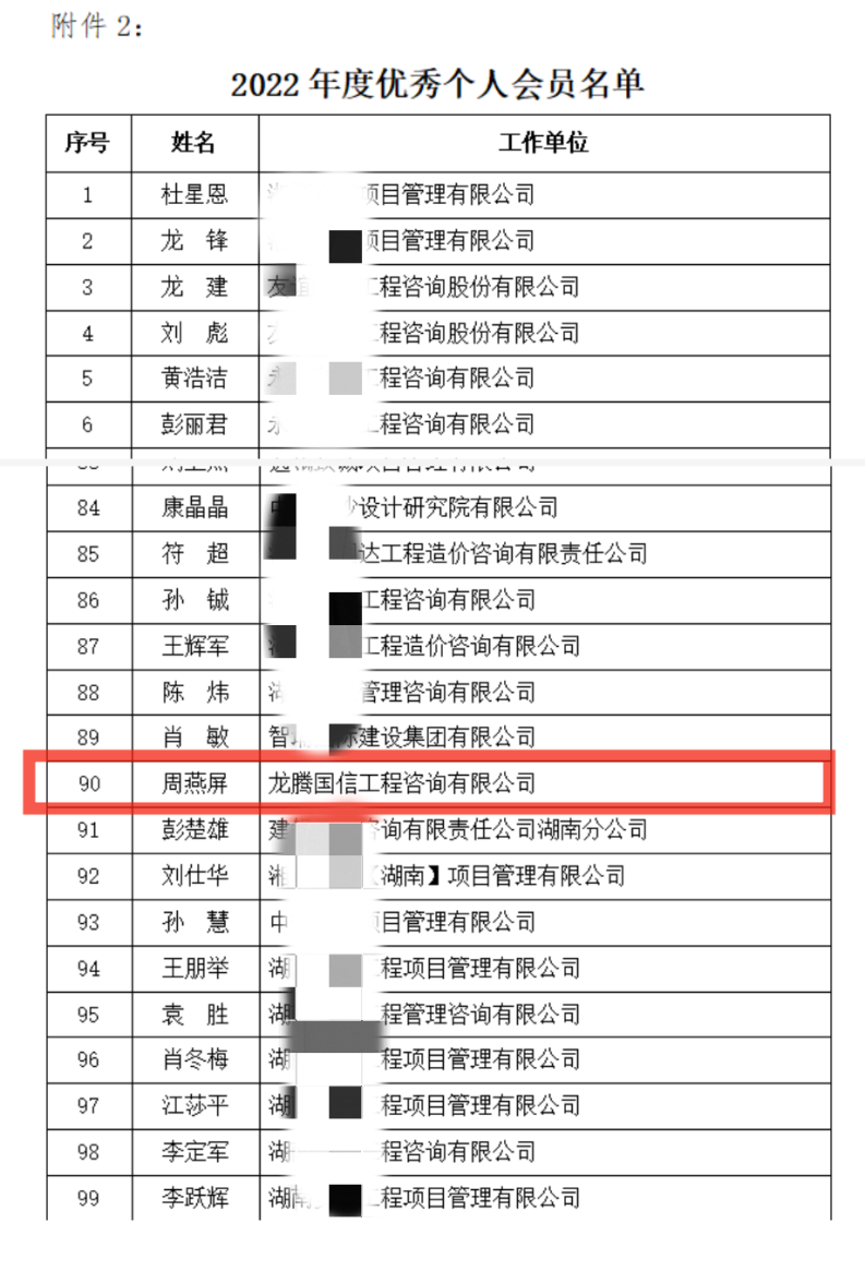 2022年,湖南省建設工程造價管理協會會員堅持以習近平新時代中國特色社會主義思想為指導,全面貫徹黨的二十大精神,以實干擔當的精神、攻堅克難的韌勁,推動各項工作取得實效,保持了高質量發(fā)展的良好勢頭,涌現出一大批優(yōu)秀會員單位和優(yōu)秀個人會員。為鼓勵先進,樹立典型,充分調動會員的積極性和創(chuàng)造性,根據《湖南省建設工程造價管理協會關于開展2022年度評選優(yōu)秀會員活動的通知》(湘建價協【2023】10號)要求,經會員申報、評審小組評審、集體研究、結果公示,“龍騰國信工程咨詢有限公司”榮獲湖南省建設工程造價管理協會2022年度“優(yōu)秀單位”、公司造價工程師周燕屏獲“優(yōu)秀個人”榮譽稱號。