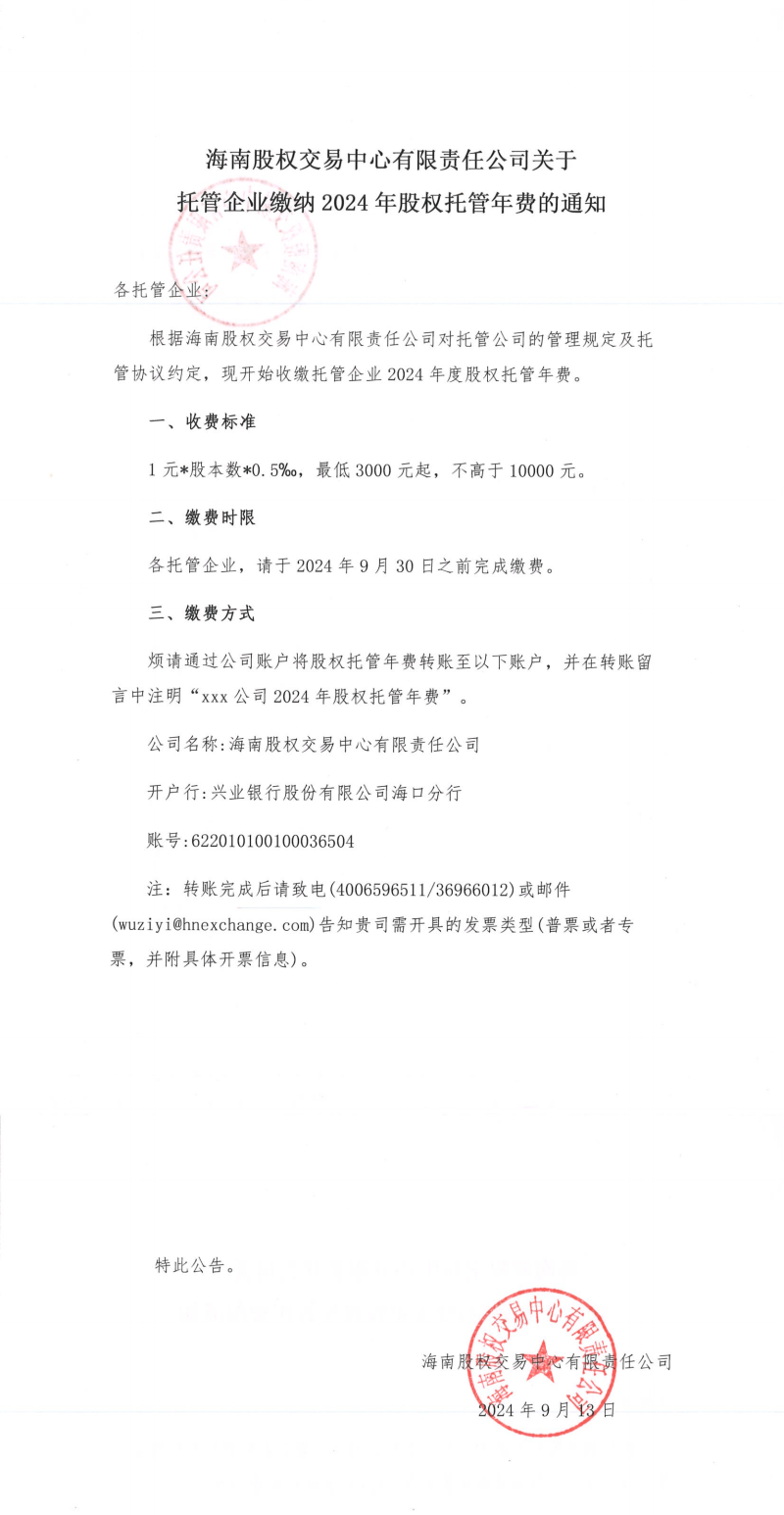 海南股權(quán)交易中心有限責(zé)任公司關(guān)于托管企業(yè)繳納2024年股權(quán)托管年費(fèi)的通知